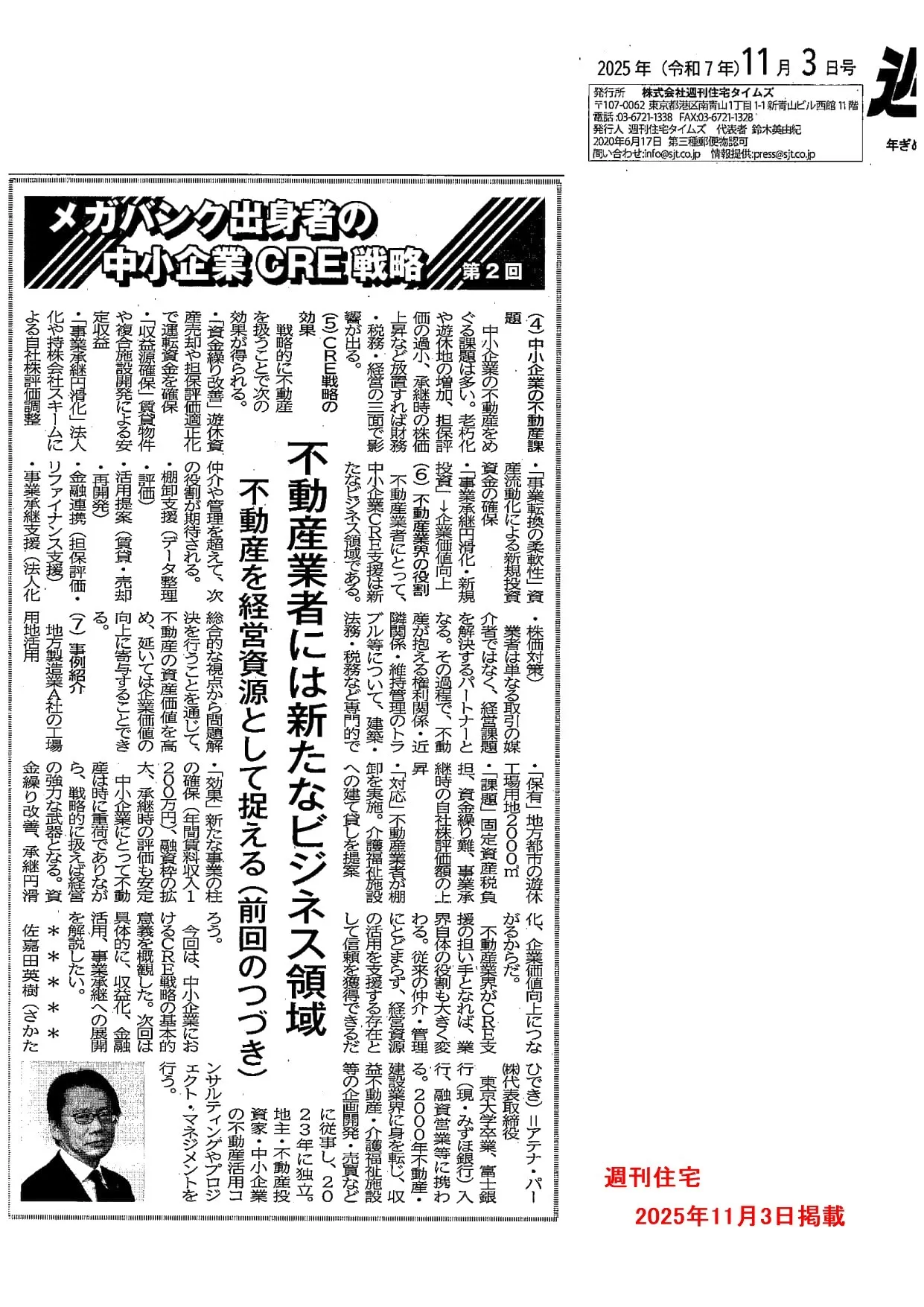 内容としては、中小企業の不動産を経営資源として活用する「CRE戦略」の実践方法を解説。遊休地の収益化や金融活用、承継対策を通じて企業価値を高める手法を紹介しています。